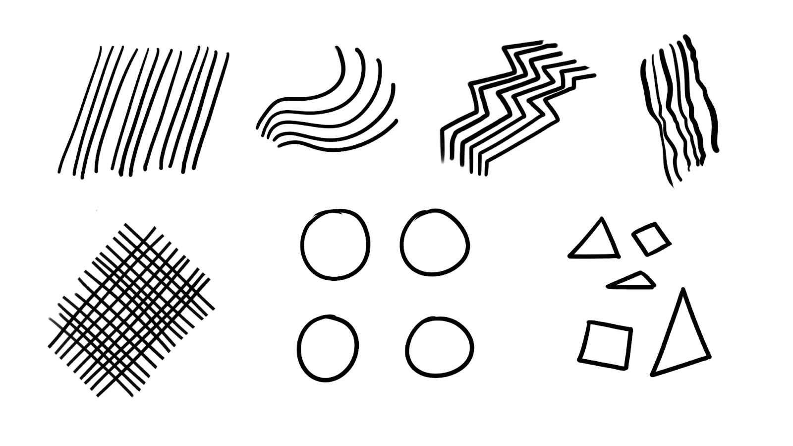 Jak trénovat: Zkus kreslit různé linie – rovné, zakřivené, různé tloušťky, v určitém pořadí, dokud nebudeš mít pocit, že je dokážeš volně ovládat. To samé pak udělej s tvary: kresli je tak dlouho, dokud se nebudeš cítit jistě a nebudeš jim rozumět.