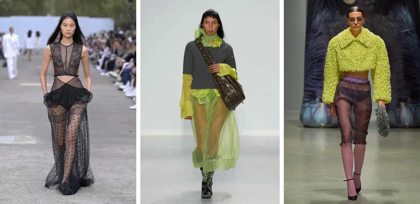 Průhledné prvky v kolekcích Stella McCartney, Ganni a Ester Manas, SS25.