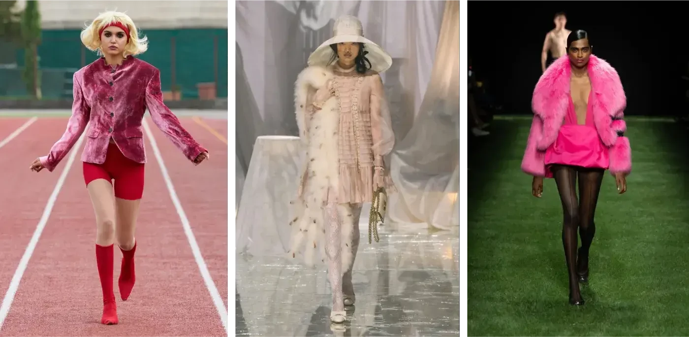 Růžová stále dominuje v kolekcích módních značek a nikam neodchází. Syté i jemnější odstíny zdobí šaty, lehké sety, kabáty, košile a samozřejmě i kožichy (abychom nezapomněli, že barbie éru předcházela odvážná doba Scream Queens).
