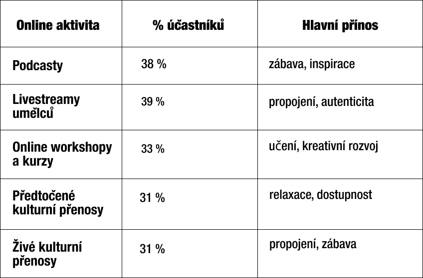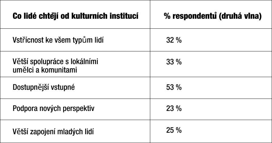 Tohle nové publikum navíc nejsou náhodní klikaři, ale reálně nadšení diváci, posluchači a účastníci. Celých 68 % respondentů v druhé vlně výzkumu uvedlo, že je pro ně důležité, aby byl online kulturní obsah zdarma. A 62 % ocenilo, když měli přístup ke kulturním institucím nebo umělcům z jiných míst světa.