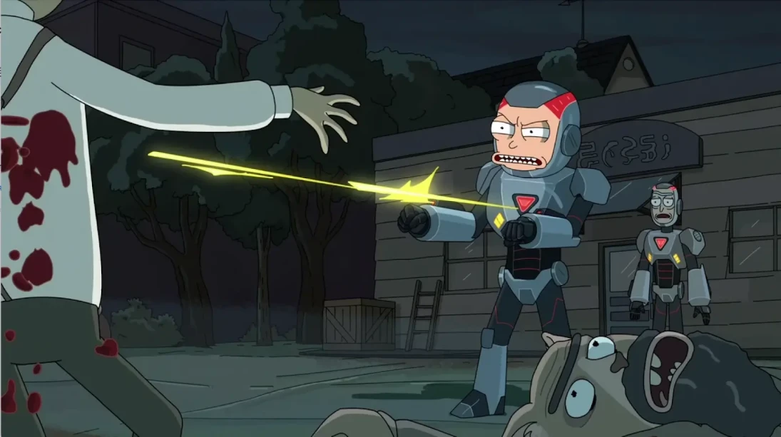 Například v epizodě Pickle Rick se hlavní hrdina promění v okurku a dostane se do mnoha situací, v nichž musí být krutý, aby přežil. Stejně jako v jiných epizodách ani v tomhle případě nemá jednání postavy žádné následky. Cílem je přimět diváka k morálnímu nepohodlí a k zamyšlení nad ospravedlnitelností násilí ve fikčních světech.