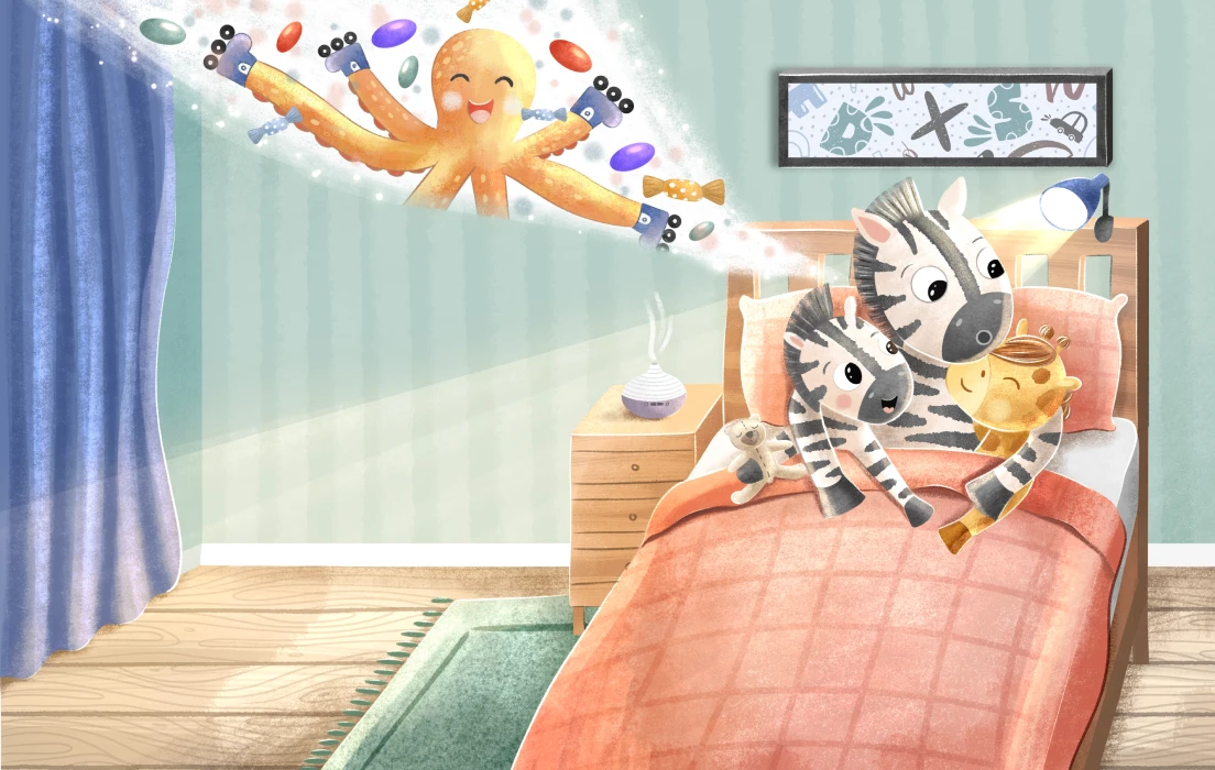 Môjmu srdcu najmilšia je asi ilustrácia z knihy Žirinka a Zebrička spoznávajú emócie, ktorá vyšla na jar tohto roka v slovenskom jazyku. Je to scéna, kde večer ocko rozpráva dvom sestričkám príbeh na dobrú noc a všetci spolu ležia v posteli.
